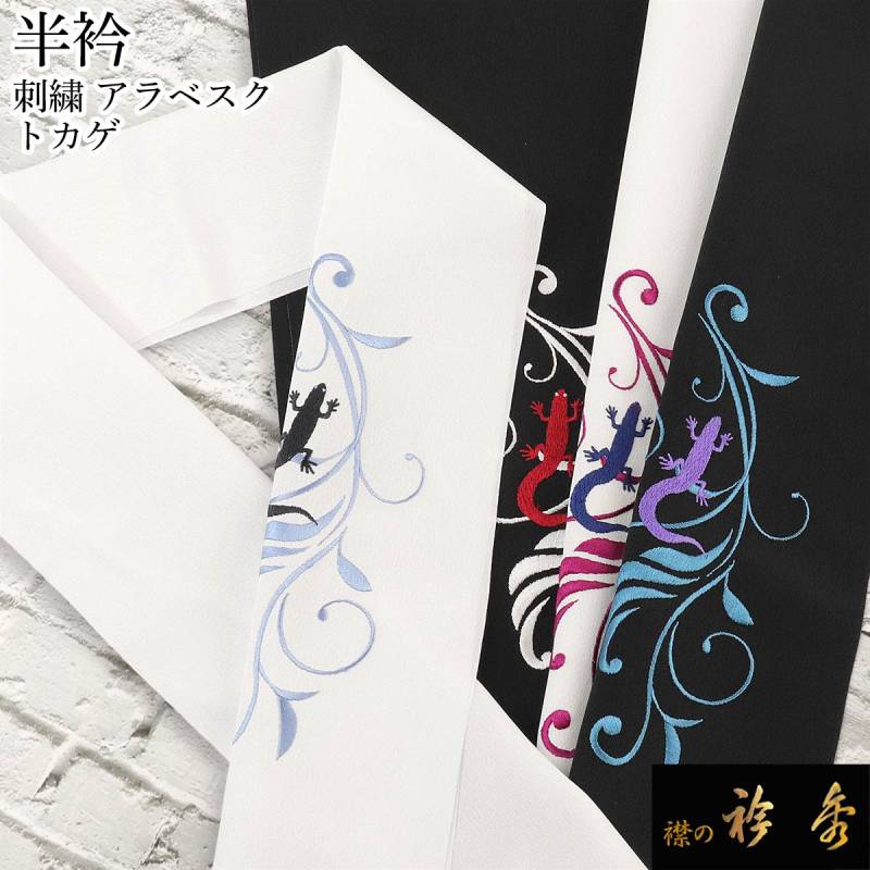 衿秀 公式 半衿 はんえり 刺繍 トカゲ 唐草 アラベスク 蜥蜴 とかげ ワンポイント 黒 白 日本製 和装小物 和小物 えりひで 襟の衿秀 tb