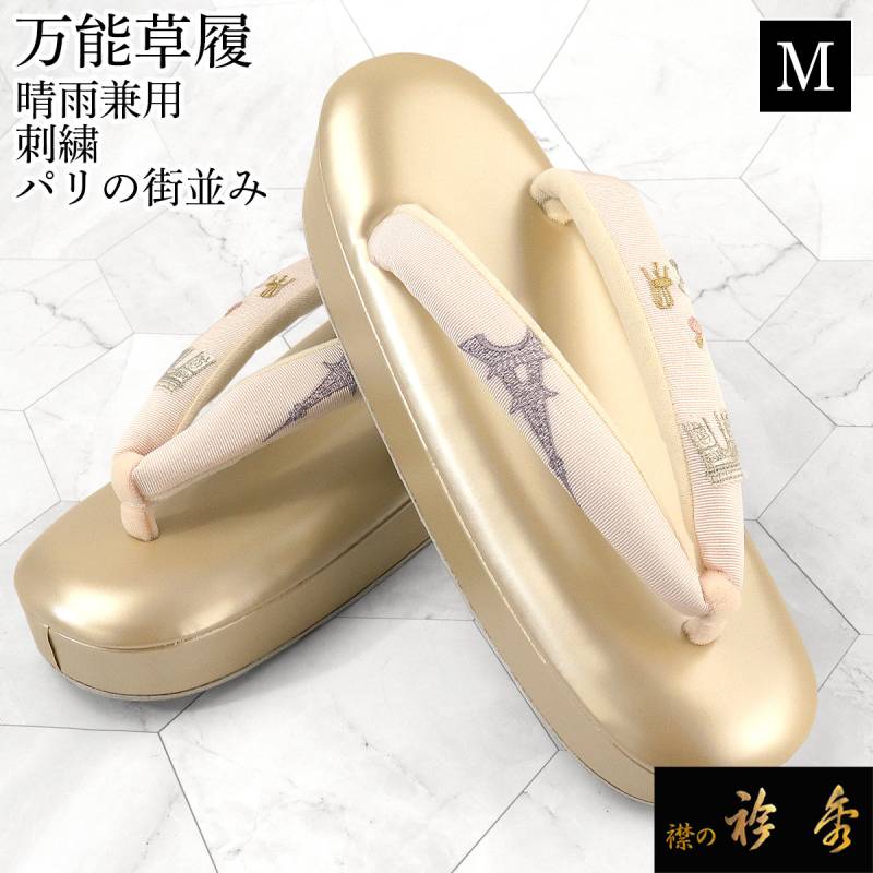 衿秀 公式 草履 ぞうり 刺繍 晴雨 晴雨兼用 パリ エッフェル塔 凱旋門 ゴールド M シャレ 普段着 履きやすい 防水 日本製 雨 襟の衿秀 sp