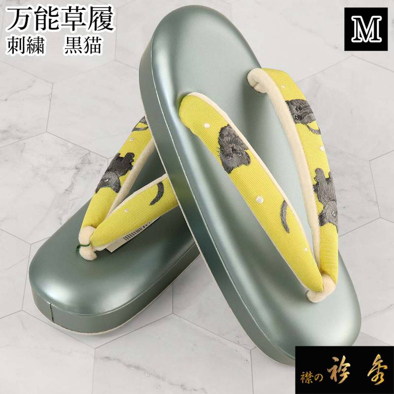 衿秀 公式 草履 ぞうり 晴雨 晴雨兼用 刺繍 ねこ 猫 黒猫 黄色 M シャレ 普段着 履きやすい 防水 日本製 雨 襟の衿秀 sp