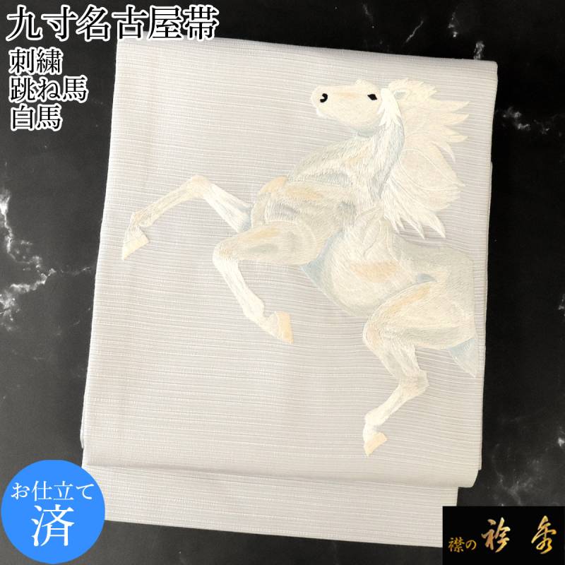 衿秀 公式 帯 名古屋帯 おび 九寸 仕立て上がり 跳ね馬 馬蹄 うま ウマ 白 ホワイト アイスグレー 紬 刺繍 日本製 和装小物 和小物 えりひで 襟の衿秀