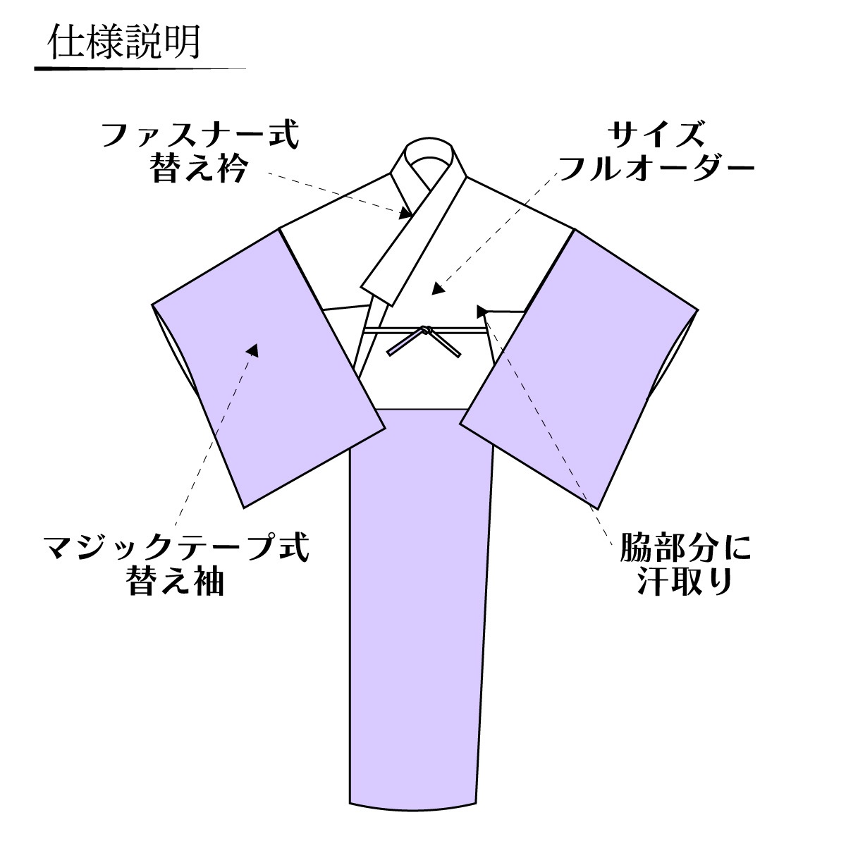 汗をかきやすい脇部分にはガーゼの汗取りが付いておりますので、汗かきの方も安心してお召しいただけます。