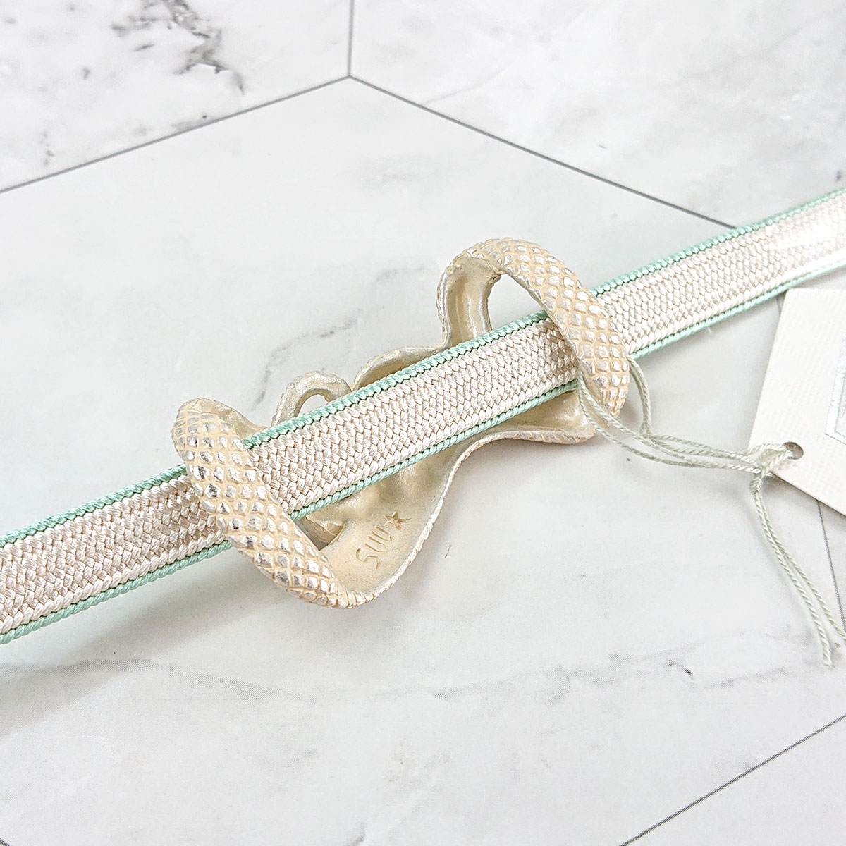 とぐろを巻こうとしている姿と鱗を繊細に美しく表現しました。帯締めを蛇の体の隙間に直接通すデザインとなっています。