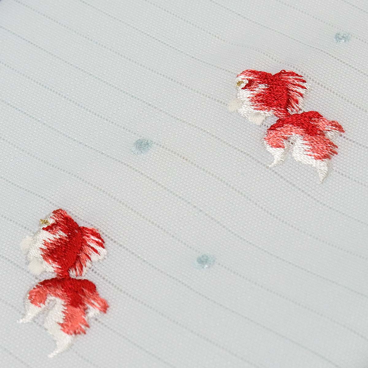 淡いブルーの絽の生地に金魚の柄を刺繍で表現しました。