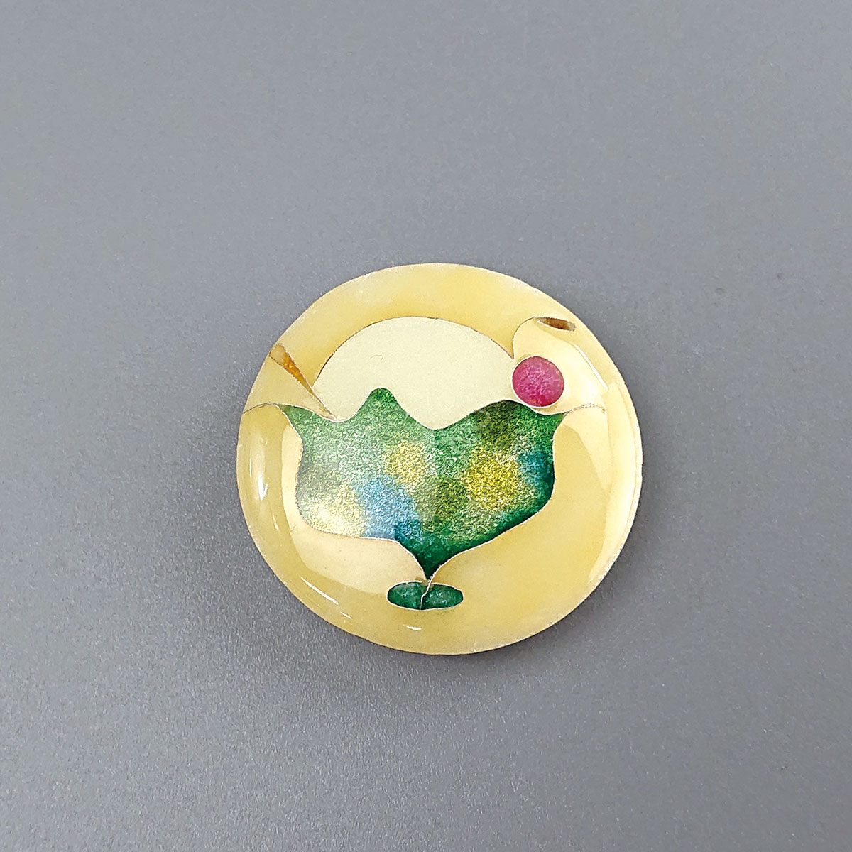 でも、可愛いだけではありません。 40年以上この道一筋の職人さんが、一点作るのに数時間費やし、丹精込めて制作してくださいました。京都の伝統工芸「七宝焼」の中でも特に難易度の高い、「有線七宝」で作られています。小さな丸いベースのなかに、極細の銀線で紋様の輪郭をつくり、そこに釉薬を入れて窯で焼きます。釉薬を入れて焼き、また別の色の釉薬を重ねて焼き、また別の色を… するとなんとも言えない複雑な色合いに。