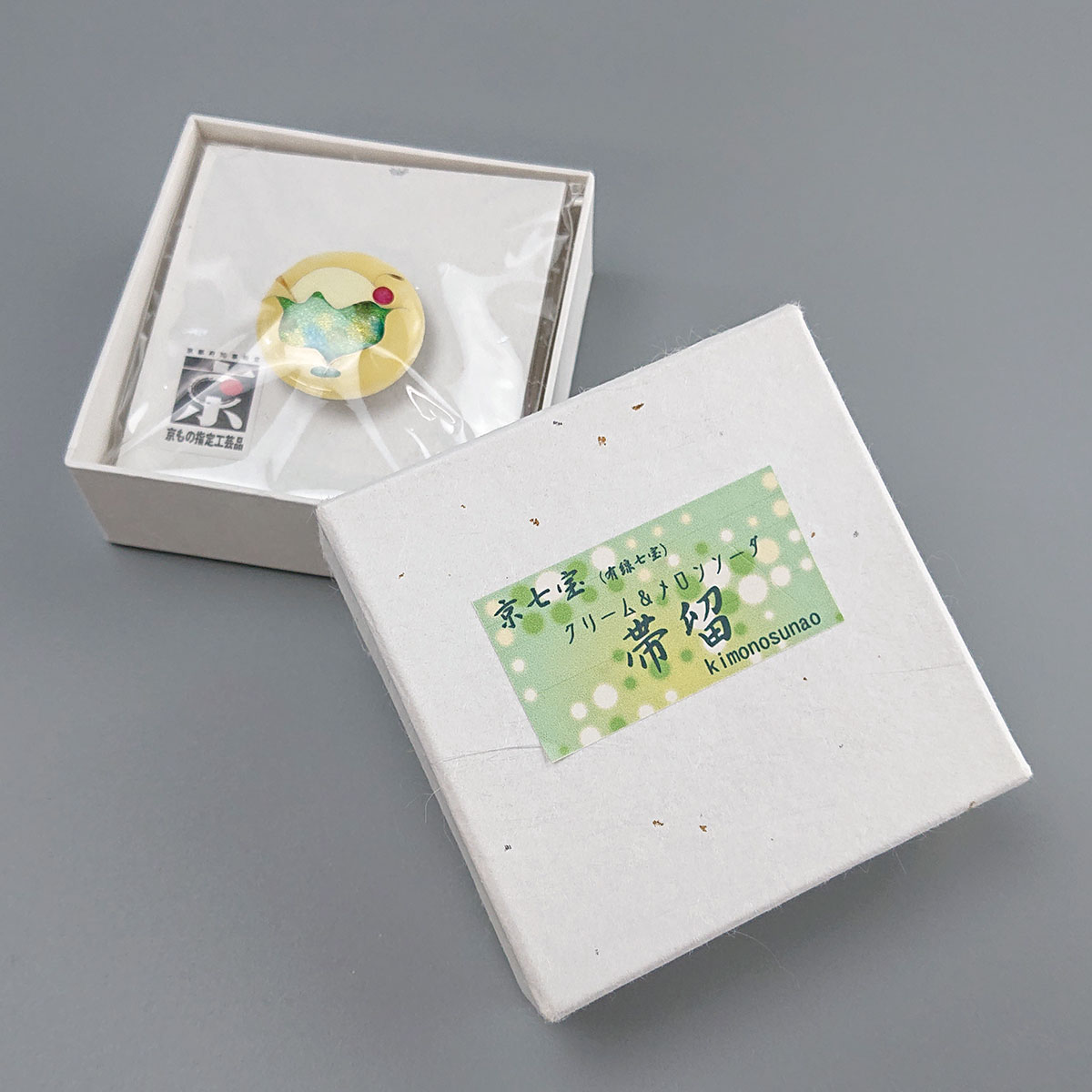 アイスの部分は、丁寧に表面を削って艶消しに。こだわりぬいた、でも思わずふふっと笑えるような、愛らしい帯留です。クリームソーダは一見するとポップなモチーフですが、かつての名だたる文豪が愛したと言われています。古典的な着物や帯に合わせて、コーディネートに物語を乗せるのも楽しいのではないでしょうか。