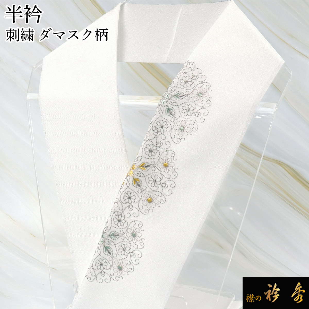 衿秀 公式 半衿 はんえり 刺繍 ダマスク柄 洋柄 青朽葉 薄水色 芥子色 白地 洗える ポリエステル 日本製 和装小物 和小物 えりひで 襟の衿秀