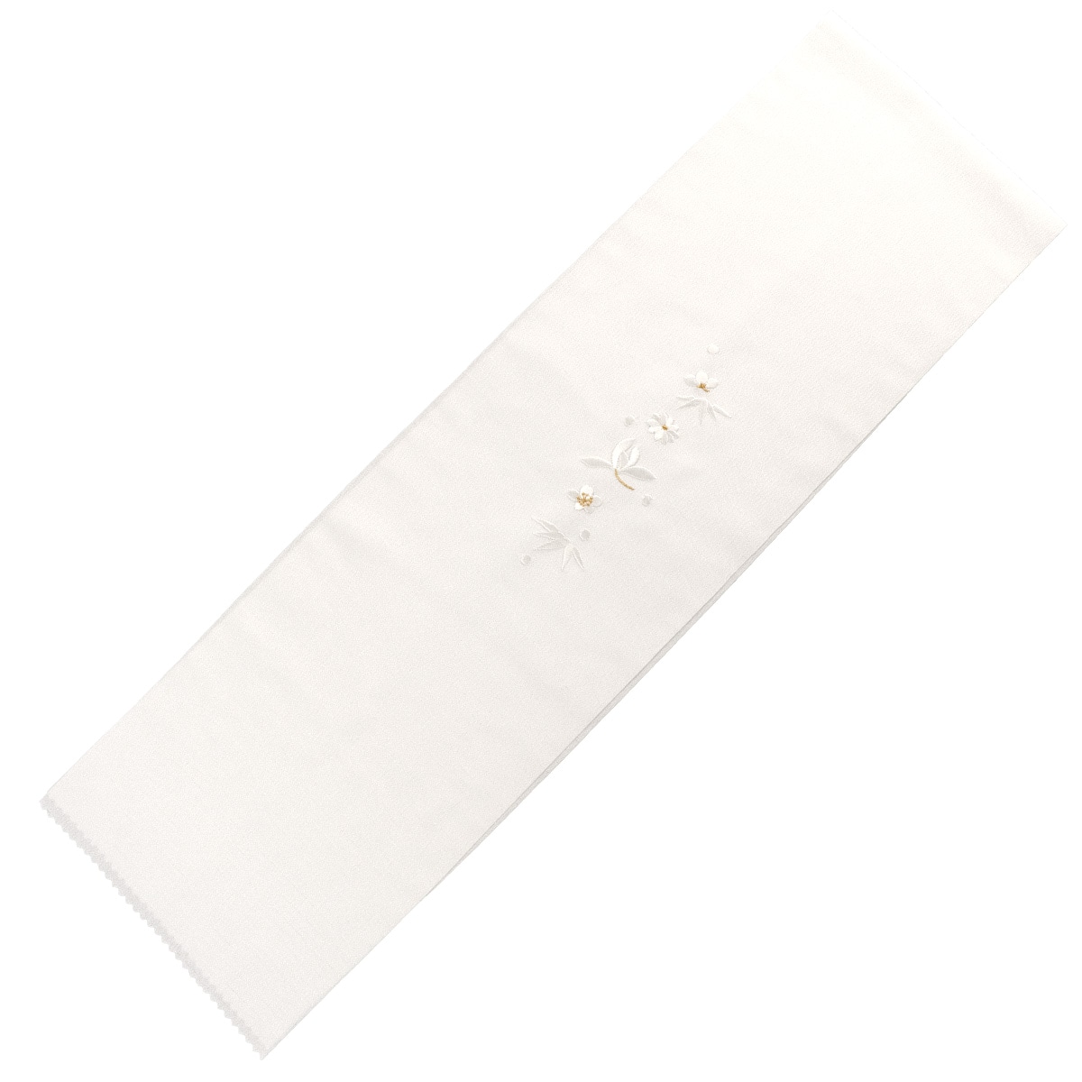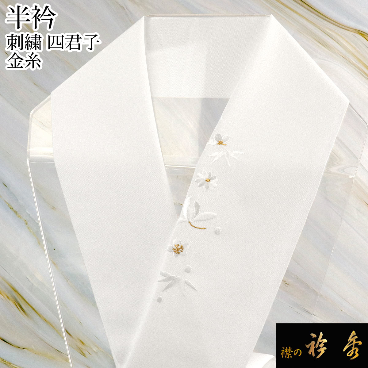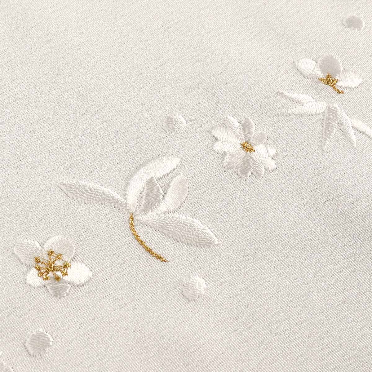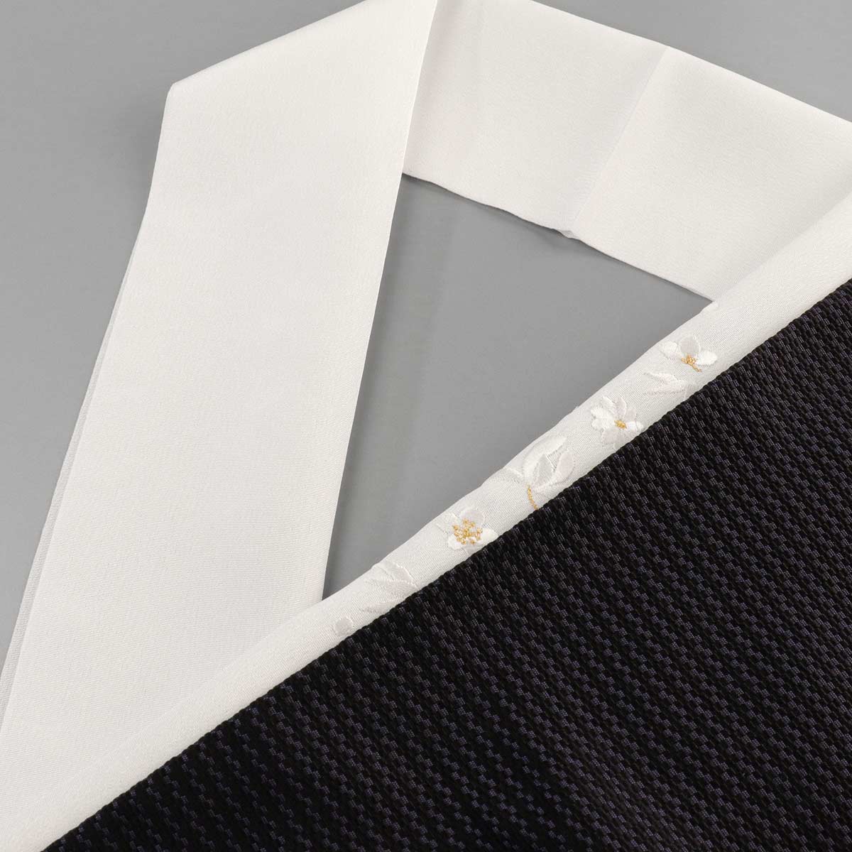 衿地と同じ白の糸で四君子模様が刺繍されています。