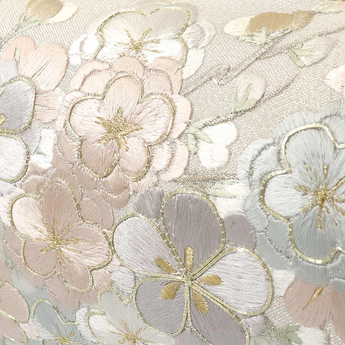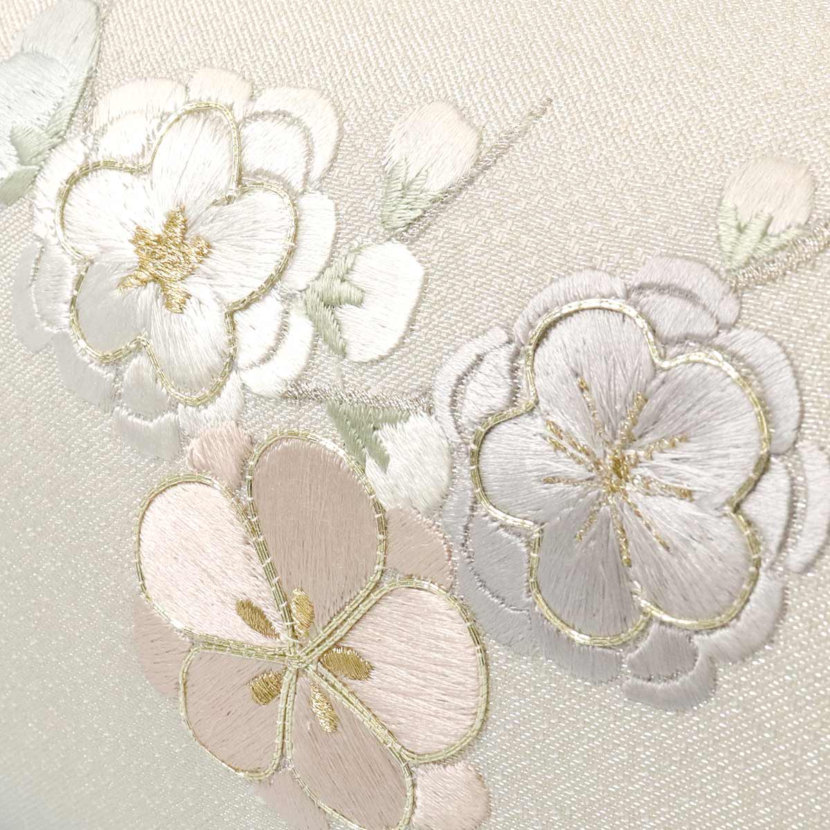 前面には梅と桜の金駒刺繍がデザインされています。