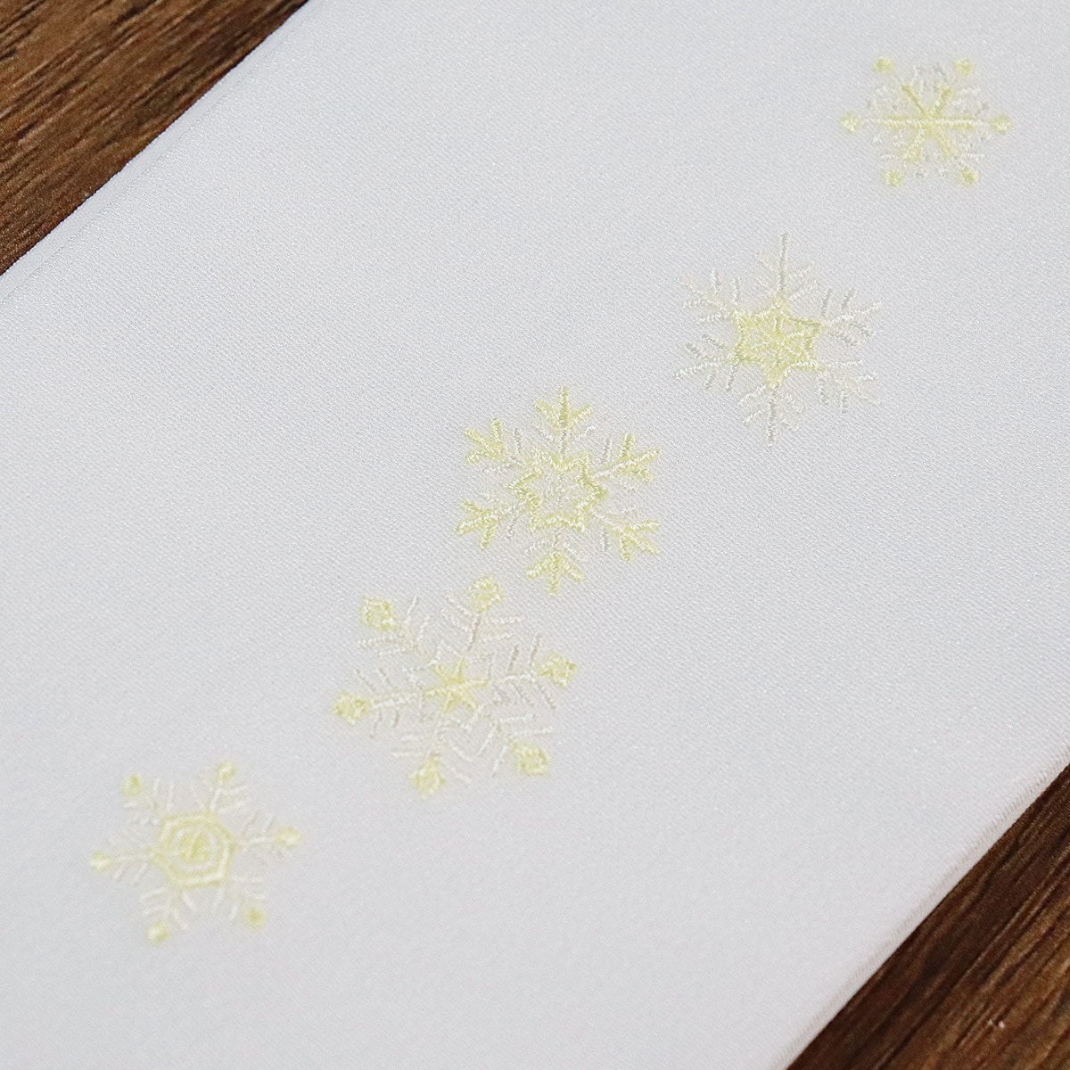 白地の半衿に黄色の雪の結晶を刺繍しました。